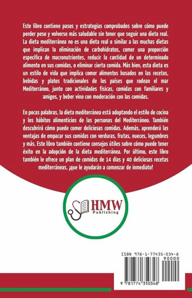 Este libro contiene pasos y estrategias comprobados sobre como puede perder peso y volverse mas saludable sin tener que seguir una dieta real. La dieta mediterranea no es una dieta real o similar a las muchas dietas que implican la eliminacion de carbohidratos, comer una proporcion especifica de macronutrientes, reducir la cantidad de un determinado alimento en sus comidas, o eliminar cierta comida. Mas bien, esta dieta es un estilo de vida que implica comer alimentos basados en las recetas, bebidas y platos tradicionales de los paises que rodean el mar Mediterraneo, junto con actividades fisicas, comidas con familiares y amigos, y beber vino con moderacion con las comidas. En pocas palabras, la dieta mediterranea esta adoptando el estilo de cocina y los habitos alimenticios de las personas del Mediterraneo. Tambien descubrira como puede comer deliciosas comidas. Ademas, aprendera las ventajas de empacar sus comidas con verduras, frutas, nueces, legumbres y mas. Este libro tambien contiene consejos utiles sobre como puede tener exito en la adopcion de la dieta mediterranea. Por ultimo, este libro tambien le ofrece un plan de comidas de 14 dias y 40 deliciosas recetas mediterraneas, que le ayudaran a comenzar de inmediato!