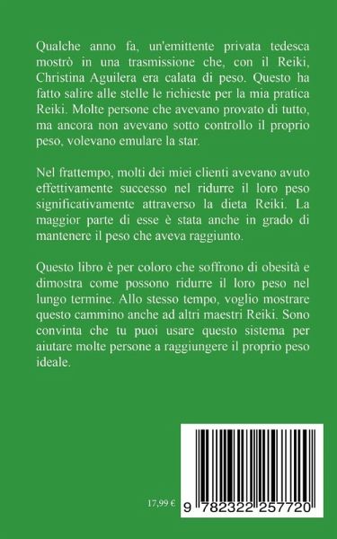 Qualche anno fa, un'emittente privata tedesca mostrò in una trasmissione che, con il Reiki, Christina Aguilera era calata di peso. Questo ha fatto salire alle stelle le richieste per la mia pratica Reiki. Molte persone che avevano provato di tutto, ma ancora non avevano sotto controllo il proprio peso, volevano emulare la star. Nel frattempo, molti dei miei clienti avevano avuto effettivamente successo nel ridurre il loro peso significativamente attraverso la dieta Reiki. La maggior parte di esse è stata anche in grado di mantenere il peso che aveva raggiunto. Questo libro è per coloro che soffrono di obesità e dimostra come possono ridurre il loro peso nel lungo termine. Allo stesso tempo, voglio mostrare questo cammino anche ad altri maestri Reiki. Sono convinta che tu puoi usare questo sistema per aiutare molte persone a raggiungere il proprio peso ideale.