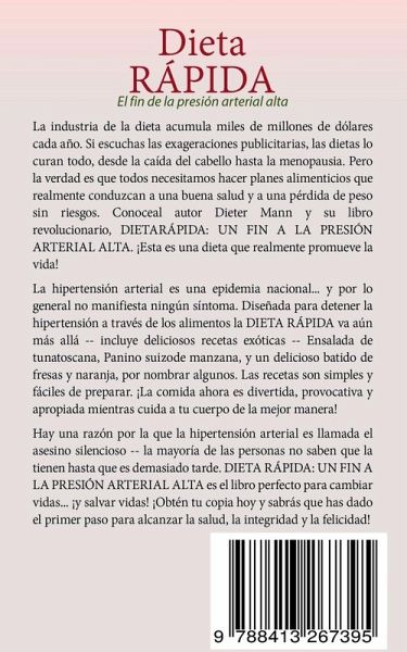La industria de la dieta acumula miles de millones de dólares cada año. Si escuchas las exageraciones publicitarias, las dietas lo curan todo, desde la caída del cabello hasta la menopausia. Pero la verdad es que todos necesitamos hacer planes alimenticios que realmente conduzcan a una buena salud y a una pérdida de peso sin riesgos. Conoce al autor Dieter Mann y su libro revolucionario, DIETA RÁPIDA: UN FIN A LA PRESIÓN ARTERIAL ALTA. ¡Esta es una dieta que realmente promueve la vida! La hipertensión arterial es una epidemia nacional... y por lo general no manifiesta ningún síntoma. Diseñada para detener la hipertensión a través de los alimentos la DIETA RÁPIDA va aún más allá -- incluye deliciosos recetas exóticas -- Ensalada de tuna toscana, Panino suizo de manzana, y un delicioso batido de fresas y naranja, por nombrar algunos. Las recetas son simples y fáciles de preparar. ¡La comida ahora es divertida, provocativa y apropiada mientras cuida a tu cuerpo de la mejor manera! Hay una razón por la que la hipertensión arterial es llamada el asesino silencioso -- la mayoría de las personas no saben que la tienen hasta que es demasiado tarde. DIETA RÁPIDA: UN FIN A LA PRESIÓN ARTERIAL ALTA es el libro perfecto para cambiar vidas... ¡y salvar vidas! ¡Obtén tu copia hoy y sabrás que has dado el primer paso para alcanzar la salud, la integridad y la felicidad!