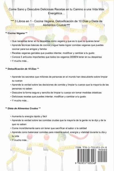 Come Sano y Descubre Deliciosas Recetas en tu Camino a una Vida Más Energética… *** 3 Manuscritos - Cocina Vegana, Detoxificación de 10 Días y Dieta de Alimentos Crudos *** ** Cocina Vegana ** Primero aprenderás lo básico sobre ser vegano. Incluso si crees que sabes todo, esta sección te ayudará a "cristalizar" la forma en la que comes… También aprenderás sobre ingredientes en la cocina vegana, de los que no sabías nada. ¡Esta sección podría aumentar tu placer al comer & el sabor de tu comida! Más temas por cubrir: * Que necesitas tener en tu despensa como vegano y que es lo que no quieres tener * Aprende técnicas básicas de cocina y sigue hasta lograr comidas veganas que puedes cocinar para tus amigos y familia * Información nutrimental así como que tipo de nutrientes necesitas como vegano y como obtenerlos * Recetas veganas geniales que puedes intentar, modificar y cambiar a tu gusto * Conoce 5 artículos importantes que todos los veganos DEBEN tener en su despensa * Y mucho más... ** Detoxificación de 10 Días ** Puedes absolutamente reclamar la energía juvenil que tuviste alguna vez hace muchos años sin cambios tan grandes... Puedes eliminar padecimientos y dolores casi sin esfuerzo mientras fortaleces tu cuerpo contra futuras enfermedades... Temas que se tratarán en el interior: * Aprende los secretos que millones de personas en el mundo han descubierto sobre limpiar su cuerpo * Descubre la forma segura y sencilla de limpiar tu cuerpo sin tomar medidas drásticas * Deliciosas recetas que puedes intentar, modificar y cambiar a tu gusto * Aumenta tu energía sin tomar miles de pastillas, suplementos o bebidas asquerosas * Y mucho más... ** Dieta de Alimentos Crudos ** Aprenderás todo lo que quieres saber sobre la comida cruda y la dieta de la comida cruda. También vivirás una vida más memorable, productiva y larga con esta simple conversión a