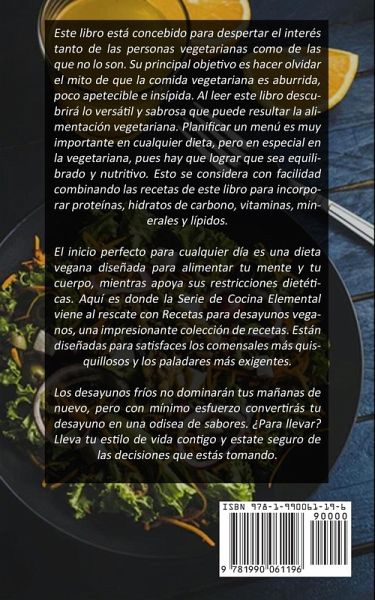 Este libro está concebido para despertar el interés tanto de las personas vegetarianas como de las que no lo son. Su principal objetivo es hacer olvidar el mito de que la comida vegetariana es aburrida, poco apetecible e insípida. Al leer este libro descubrirá lo versátil y sabrosa que puede resultar la alimentación vegetariana. Planificar un menú es muy importante en cualquier dieta, pero en especial en la vegetariana, pues hay que lograr que sea equilibrado y nutritivo. Esto se considera con facilidad combinando las recetas de este libro para incorporar proteínas, hidratos de carbono, vitaminas, minerales y lípidos. El inicio perfecto para cualquier día es una dieta vegana diseñada para alimentar tu mente y tu cuerpo, mientras apoya sus restricciones dietéticas. Aquí es donde la Serie de Cocina Elemental viene al rescate con Recetas para desayunos veganos, una impresionante colección de recetas. Están diseñadas para satisfaces los comensales más quisquillosos y los paladares más exigentes. Los desayunos fríos no dominarán tus mañanas de nuevo, pero con mínimo esfuerzo convertirás tu desayuno en una odisea de sabores. ¿Para llevar? Lleva tu estilo de vida contigo y estate seguro de las decisiones que estás tomando.