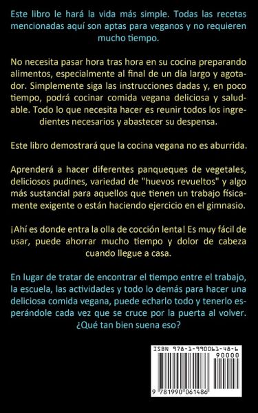 Este libro le hará la vida más simple. Todas las recetas mencionadas aquí son aptas para veganos y no requieren mucho tiempo. No necesita pasar hora tras hora en su cocina preparando alimentos, especialmente al final de un día largo y agotador. Simplemente siga las instrucciones dadas y, en poco tiempo, podrá cocinar comida vegana deliciosa y saludable. Todo lo que necesita hacer es reunir todos los ingredientes necesarios y abastecer su despensa. Este libro demostrará que la cocina vegana no es aburrida. Aprenderá a hacer diferentes panqueques de vegetales, deliciosos pudines, variedad de "huevos revueltos" y algo más sustancial para aquellos que tienen un trabajo físicamente exigente o están haciendo ejercicio en el gimnasio. ¡Ahí es donde entra la olla de cocción lenta! Es muy fácil de usar, puede ahorrar mucho tiempo y dolor de cabeza cuando llegue a casa. En lugar de tratar de encontrar el tiempo entre el trabajo, la escuela, las actividades y todo lo demás para hacer una deliciosa comida vegana, puede echarlo todo y tenerlo esperándole cada vez que se cruce por la puerta al volver. ¿Qué tan bien suena eso?