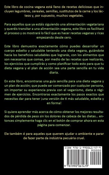 Este libro de cocina vegana está lleno de recetas deliciosas que incluyen legumbres, cereales, semillas, sustitutos de la carne y los lácteos y, por supuesto, muchos vegetales. Para aquellos que ya estáis siguiendo una alimentación vegetariana y queréis transitar a una alimentación vegana, este libro os facilitará el proceso y os mostrará lo fácil que es hacer recetas veganas y ricas empezando desde cero. Este libro demuestra exactamente cómo puedes desarrollar un cuerpo esbelto y saludable teniendo una dieta vegana, guiándote hacia los beneficios saludables que lograrás, con los alimentos que son necesarios que comas, por medio de las recetas que realizarás, los ejercicios que cumplirás y como planificar todo esto para que tu dieta vegana y el plan de acción sea una parte sencilla en tu vida diaria. En este libro, encontraras una guía sencilla para una dieta vegana y un plan de acción; que puede ser comenzado por cualquier persona, sin importar su experiencia previa con el veganismo, dieta o régimen de ejercicios. Encontraras exactamente los pasos exactos que necesitas dar para tener ¡una versión de ti más saludable, esbelta y en forma! Si quiere aprender más acerca de cómo obtener los mejores resultados de pérdida de peso sin los dolores de cabeza de las dietas... entonces simplemente haga clic en el botón de comprar ahora en esta página para comenzar. Ele também é para aqueles que querem ajudar o ambiente e parar de fazer parte da indústria pecuária cruel.