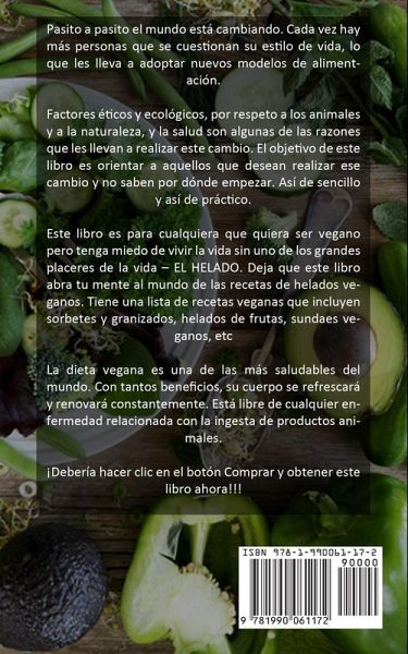 Pasito a pasito el mundo está cambiando. Cada vez hay más personas que se cuestionan su estilo de vida, lo que les lleva a adoptar nuevos modelos de alimentación. Factores éticos y ecológicos, por respeto a los animales y a la naturaleza, y la salud son algunas de las razones que les llevan a realizar este cambio. El objetivo de este libro es orientar a aquellos que desean realizar ese cambio y no saben por dónde empezar. Así de sencillo y así de práctico. Este libro es para cualquiera que quiera ser vegano pero tenga miedo de vivir la vida sin uno de los grandes placeres de la vida - EL HELADO. Deja que este libro abra tu mente al mundo de las recetas de helados veganos. Tiene una lista de recetas veganas que incluyen sorbetes y granizados, helados de frutas, sundaes veganos, etc La dieta vegana es una de las más saludables del mundo. Con tantos beneficios, su cuerpo se refrescará y renovará constantemente. Está libre de cualquier enfermedad relacionada con la ingesta de productos animales.