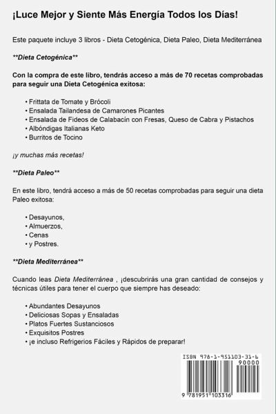 ¡Luce Mejor y Siente Más Energía Todos los Días! *** 3 Manuscritos en 1 Libro - Dieta Cetogénica, Dieta Paleo, Dieta Mediterránea *** **Dieta Cetogénica** Con este fascinante libro aprenderás más sobre las diferentes variantes de la Dieta Cetogénica: * Estándar * Alta en Proteínas * Dirigida * y Cíclica El poder de la Dieta Cetogénica está en eliminar la ingesta de casi todos los carbohidratos. En este manual instructivo, puedes descubrir cuáles comidas contienen la mayor cantidad de proteínas y grasas saludables – y cuáles tienen menos carbohidratos. Por ejemplo, puedes disfrutar de carnes, nueces, pescados, vegetales verdes y verduras bajas en carbohidratos, ¡como cebollas y tomates! Con la compra de este libro, tendrás acceso a más de 70 recetas comprobadas para seguir una Dieta Cetogénica exitosa: 1. Frittata de Tomate y Brócoli 2. Ensalada Tailandesa de Camarones Picantes 3. Ensalada de Fideos de Calabacín con Fresas, Queso de Cabra y Pistachos 4. Albóndigas Italianas Keto 5. Burritos de Tocino 6. Salmón al Horno con Hierbas 7. Cheesecake de Brownie ¡y muchas más recetas! **Dieta Paleo** Este completo libro de recetas contiene pasos prácticos y estrategias sobre cómo preparar y comer adecuadamente más de 50 Recetas Saludables inspiradas por la Dieta Paleo: * Desayunos, * Almuerzos, * Cenas * y Postres. **Dieta Mediterránea** Cuando leas Dieta Mediterránea , ¡descubrirás una gran cantidad de consejos y técnicas útiles para tener el cuerpo que siempre has deseado! Con estas recetas, aprenderás a preparar: 8. Abundantes Desayunos 9. Deliciosas Sopas y Ensaladas 10. Platos Fuertes Susta