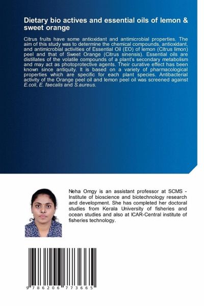 Citrus fruits have some antioxidant and antimicrobial properties. The aim of this study was to determine the chemical compounds, antioxidant, and antimicrobial activities of Essential Oil (EO) of lemon (Citrus limon) peel and that of Sweet Orange (Citrus sinensis). Essential oils are distillates of the volatile compounds of a plant's secondary metabolism and may act as photoprotective agents. Their curative effect has been known since antiquity. It is based on a variety of pharmacological properties which are specific for each plant species. Antibacterial activity of the Orange peel oil and lemon peel oil was screened against E.coli, E. faecalis and S.aureus.