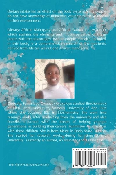 Dietary intake has an effect on the body system. Many people do not have knowledge of numerous valuable nutritive foods in their environment. Dietary: African Mahogany and African Walnut is a write up which explains the elements and nutritive values of these plants with the advantages towards people's health. Included in this book is a comprehensive research of the nutrients derived from African walnut and African mahogany.