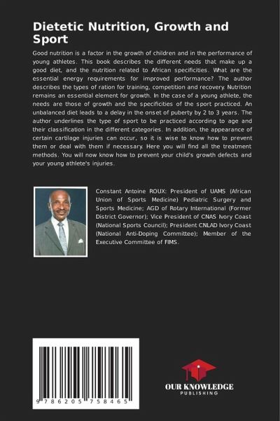 Good nutrition is a factor in the growth of children and in the performance of young athletes. This book describes the different needs that make up a good diet, and the nutrition related to African specificities. What are the essential energy requirements for improved performance? The author describes the types of ration for training, competition and recovery. Nutrition remains an essential element for growth. In the case of a young athlete, the needs are those of growth and the specificities of the sport practiced. An unbalanced diet leads to a delay in the onset of puberty by 2 to 3 years. The author underlines the type of sport to be practiced according to age and their classification in the different categories. In addition, the appearance of certain cartilage injuries can occur, so it is wise to know how to prevent them or deal with them if necessary. Here you will find all the treatment methods. You will now know how to prevent your child's growth defects and your young athlete's injuries.