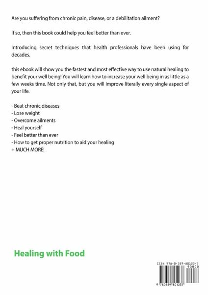 Are you suffering from chronic pain, disease, or a debilitation ailment? If so, then this book could help you feel better than ever. Introducing secret techniques that health professionals have been using for decades. this ebook will show you the fastest and most effective way to use natural healing to benefit your well being! You will learn how to increase your well being in as little as a few weeks time. Not only that, but you will improve literally every single aspect of your life. - Beat chronic diseases - Lose weight - Overcome ailments - Heal yourself - Feel better than ever - How to get proper nutrition to aid your healing + MUCH MORE! Scroll to the top of the page to access instantly! Disclaimer: This author and or rights owner(s) make no claims, promises, or guarantees in regards to the accuracy, completeness, or adequacy of the contents of this book, and expressly disclaims liability for errors and omissions in the contents within. This product is for reference use only. Please consult a professional before taking action on any of the contents found within.