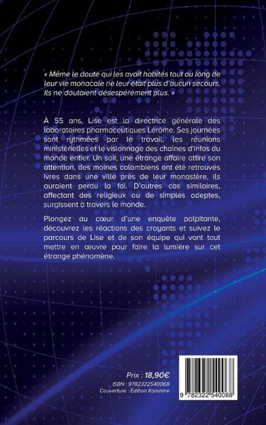 « Même sur le doute qui les avait habités tout au long de leur vie monacale ne leur était plus d'aucun secours. Ils ne doutaient désespérément plus. »À 55 ans, Lise est la directrice générale des laboratoires pharmaceutiques Lérôme. Ses journées sont rythmées par le travail, les réunions ministérielles et le visionnage des chaînées d'infos du monde entier. Un soir, une étrange affaire attire son attention, des moines colombiens ont été retrouvés ivres dans une ville près de leur monastère. D'autres cas similaires, affectant des religieux ou de simples adeptes, surgissent à travers le monde. Plongez au coeur d'une enquête palpitante, découvrez la réaction des croyants et suivez le parcours de Lise et de son équipe qui vont tout mettre en oeuvre pour faire la lumière sur cet étrange phénomène.