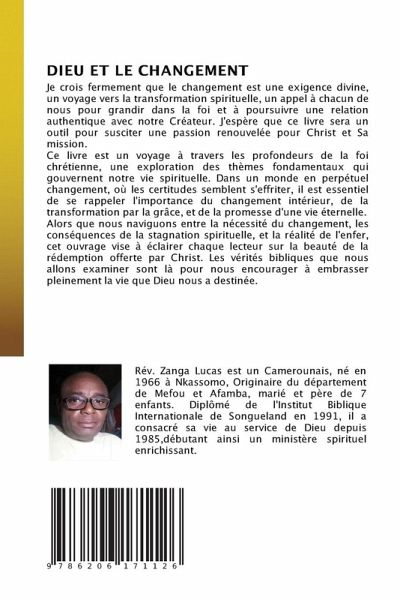 Je crois fermement que le changement est une exigence divine, un voyage vers la transformation spirituelle, un appel à chacun de nous pour grandir dans la foi et à poursuivre une relation authentique avec notre Créateur. J'espère que ce livre sera un outil pour susciter une passion renouvelée pour Christ et Sa mission.Ce livre est un voyage à travers les profondeurs de la foi chrétienne, une exploration des thèmes fondamentaux qui gouvernent notre vie spirituelle. Dans un monde en perpétuel changement, où les certitudes semblent s'effriter, il est essentiel de se rappeler l'importance du changement intérieur, de la transformation par la grâce, et de la promesse d'une vie éternelle.Alors que nous naviguons entre la nécessité du changement, les conséquences de la stagnation spirituelle, et la réalité de l'enfer, cet ouvrage vise à éclairer chaque lecteur sur la beauté de la rédemption offerte par Christ. Les vérités bibliques que nous allons examiner sont là pour nous encourager à embrasser pleinement la vie que Dieu nous a destinée.