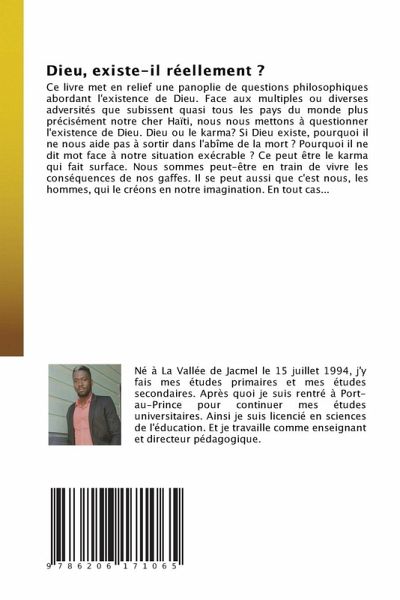 Ce livre met en relief une panoplie de questions philosophiques abordant l'existence de Dieu. Face aux multiples ou diverses adversités que subissent quasi tous les pays du monde plus précisément notre cher Haïti, nous nous mettons à questionner l'existence de Dieu. Dieu ou le karma? Si Dieu existe, pourquoi il ne nous aide pas à sortir dans l'abîme de la mort ? Pourquoi il ne dit mot face à notre situation exécrable ? Ce peut être le karma qui fait surface. Nous sommes peut-être en train de vivre les conséquences de nos gaffes. Il se peut aussi que c'est nous, les hommes, qui le créons en notre imagination. En tout cas...