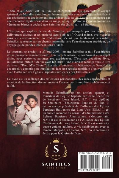 "Dieu M'a Choisi" est un livre autobiographique qui parcourt le voyage spirituel de Moralès Saintilus, un homme qui, dès son jeune âge, a fait face à des révélations et des interventions divines dans sa vie. Le récit commence par une rencontre mystérieuse dans un songe, à l'âge de onze ans, où un homme en vêtements blancs a déclaré que Saintilus est choisi par le Seigneur. L'histoire qui explore la vie de Saintilus, est marquée par des défis, des délivrances divines et un profond sens d'objectif. Quand même, avoir grandi dans un environnement où l'éducation n'était pas facilement accessible, Saintilus se trouve sur un chemin inattendu vers l'enseignement supérieur, un voyage guidé par des interventions divines. Le tournant se produit le 27 mai 2005, lorsque Saintilus a fait l'expérience d'une puissante rencontre avec Dieu dans la nature, le conduisant à un appel divin, pour écrire et partager ses expériences. C'est son deuxième livre, initialement intitulé "Ma vie avec le Christ", une vision le redirige vers le titre du livre: "Dieu M'a Choisi". Les récits montrent l'obéissance de Saintilus à cet appel, y compris son implication dans une retraite familiale d'un week-end avec l'Alliance des Églises Baptistes haïtiennes des États-Unis. Ce livre est un mélange des réflexions personnelles, des idées spirituelles et un récit de la direction divine, mettant l'accent sur l'humilité, l'obéissance et la foi.