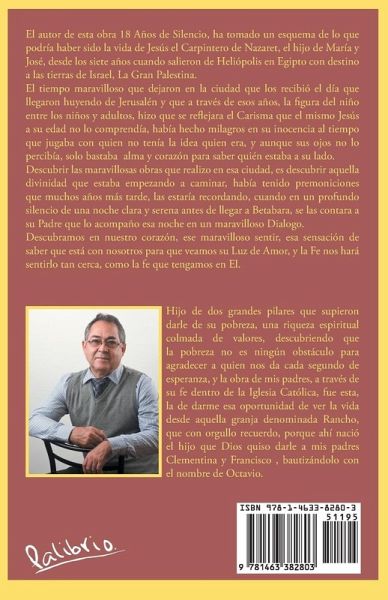 El autor de esta obra 18 Años de Silencio, ha tomado un esquema de lo que podría haber sido la vida de Jesús el Carpintero de Nazaret, el hijo de María y José, desde los siete años cuando salieron de Heliópolis en Egipto con destino a las tierras de Israel, La Gran Palestina. El tiempo maravilloso que dejaron en la ciudad que los recibió el día que llegaron huyendo de Jerusalén y que a través de esos años, la figura del niño entre los niños y adultos, hizo que se reflejara el Carisma que el mismo Jesús a su edad no lo comprendía, había hecho milagros en su inocencia al tiempo que jugaba con quien no tenía la idea quien era, y aunque sus ojos no lo percibía, solo bastaba alma y corazón para saber quién estaba a su lado. Descubrir las maravillosas obras que realizo en esa ciudad, es descubrir aquella divinidad que estaba empezando a caminar, había tenido premoniciones que muchos años más tarde, las estaría recordando, cuando en un profundo silencio de una noche clara y serena antes de llegar a Betabara, se las contara a su Padre que lo acompaño esa noche en un maravilloso Dialogo. Descubramos en nuestro corazón, ese maravilloso sentir, esa sensación de saber que está con nosotros para que veamos su Luz de Amor, y la Fe nos hará sentirlo tan cerca, como la fe que tengamos en El.