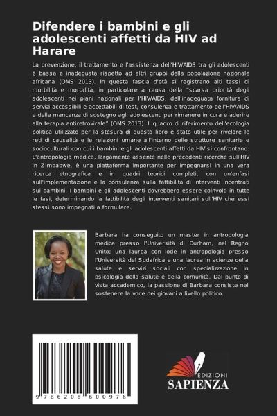 La prevenzione, il trattamento e l'assistenza dell'HIV/AIDS tra gli adolescenti è bassa e inadeguata rispetto ad altri gruppi della popolazione nazionale africana (OMS 2013). In questa fascia d'età si registrano alti tassi di morbilità e mortalità, in particolare a causa della "scarsa priorità degli adolescenti nei piani nazionali per l'HIV/AIDS, dell'inadeguata fornitura di servizi accessibili e accettabili di test, consulenza e trattamento dell'HIV/AIDS e della mancanza di sostegno agli adolescenti per rimanere in cura e aderire alla terapia antiretrovirale" (OMS 2013). Il quadro di riferimento dell'ecologia politica utilizzato per la stesura di questo libro è stato utile per rivelare le reti di causalità e le relazioni umane all'interno delle strutture sanitarie e socioculturali con cui i bambini e gli adolescenti affetti da HIV si confrontano. L'antropologia medica, largamente assente nelle precedenti ricerche sull'HIV in Zimbabwe, è una piattaforma importante per impegnarsi in una vera ricerca etnografica e in quadri teorici completi, con un'enfasi sull'implementazione e la consulenza sulla fattibilità di interventi incentrati sui bambini. I bambini e gli adolescenti dovrebbero essere coinvolti in tutte le fasi, determinando la fattibilità degli interventi sanitari sull'HIV che essi stessi sono impegnati a formulare.
