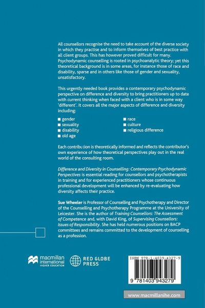 All counsellors are compelled to take account of the diverse society in which they practice and to inform themselves of best practice with all client groups. This book provides a contemporary psychodynamic perspective on difference and diversity to bring practitioners up to date with current thinking when faced with a client who is in some way 'different'. References to race, culture or disability in classical psychoanalytic literature are few. In a society that embraces diversity and seeks to afford equality for all, theories of male and female identity development need revisiting. Older people make up a large proportion of the population and religious beliefs make headline news, but psychodynamic perspectives on clinical work with such groups are limited. Indeed, the social context of the twenty first century, that provides the backdrop for the hopes, fears and aspirations of our clients, warrants attention, as people and organisations are shaped by the social systems that prevail. In the past decade equal opportunities legislation and the need to be proactive in thinking about diversity has begun to make its mark. Complacency is no longer tolerated. This book is essential reading for counsellors and psychotherapists in training and for experienced practitioners whose continuous professional development will be enhanced by re-evaluating how diversity affects their practice.
