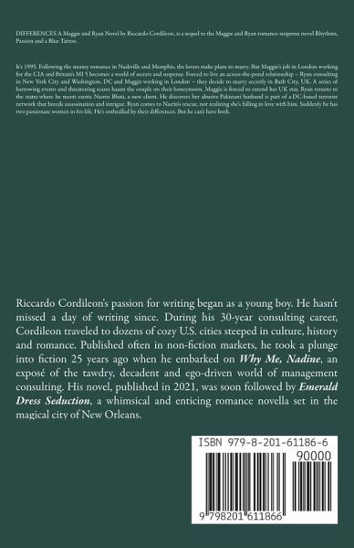 DIFFERENCES, A Maggie and Ryan Novel by Riccardo Cordileon, is a sequel to the Maggie and Ryan romance-suspense novel Rhythms, Passion and a Blue Tattoo. It's 1995. Following the steamy romance in Nashville and Memphis, the lovers make plans to marry. But Maggie's job in London working for the CIA and Britain's MI 5 becomes a world of secrets and suspense. Forced to live an across-the-pond relationship – Ryan consulting in New York City and Washington, DC and Maggie working in London – they decide to marry secretly in Bath City, UK. A series of harrowing events and threatening scares haunt the couple on their honeymoon. Maggie is forced to extend her UK stay. Ryan returns to the states where he meets exotic Nasrin Bhati, a new client. He discovers her abusive Pakistani husband is part of a DC-based terrorist network that breeds assassination and intrigue. Ryan comes to Nasrin's rescue, not realizing she's falling in love with him. Suddenly he has two passionate women in his life. He's enthralled by their differences. But he can't have both.