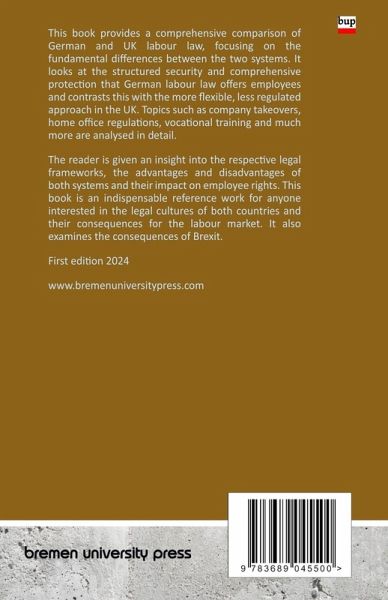 This book provides a comprehensive comparison of German and UK labour law, focusing on the fundamental differences between the two systems. It looks at the structured security and comprehensive protection that German labour law offers employees and contrasts this with the more flexible, less regulated approach in the UK. Topics such as company takeovers, home office regulations, vocational training and much more are analysed in detail. The reader is given an insight into the respective legal frameworks, the advantages and disadvantages of both systems and their impact on employee rights. This book is an indispensable reference work for anyone interested in the legal cultures of both countries and their consequences for the labour market. It also examines the consequences of Brexit.