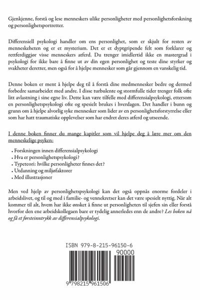 Gjenkjenne, forstå og lese menneskers ulike personligheter med personlighetsforskning og personlighetsportretter. Differensiell psykologi handler om ens personlighet, som er skjult for resten av menneskeheten og er et mysterium. Det er et dyptgripende felt som forklarer og rettferdiggjør visse menneskers atferd. Du trenger imidlertid ikke en mastergrad i psykologi for ikke bare å finne ut av din egen personlighet og teste dine styrker og svakheter deretter, men også for å hjelpe mennesker som går gjennom en vanskelig tid. Denne boken er ment å hjelpe deg til å forstå dine medmennesker bedre og dermed forbedre samarbeidet med andre. I disse turbulente og stormfulle tider trenger folk ofte litt avlastning i sine egne liv. Dette kan være tilfelle med differensialpsykologi, ettersom en personlighetspsykologi ofte og spesielt brukes i hverdagen. Det handler i bunn og grunn om å hjelpe alvorlig syke mennesker som lider av en personlighetsforstyrrelse eller som har hatt traumatiske opplevelser som har endret deres atferd og utseende. I denne boken finner du mange kapitler som vil hjelpe deg å lære mer om den menneskelige psyken:Forskningen innen differensialpsykologi Hva er personlighetspsykologi? Typeteori: hvilke personligheter finnes det? Utdanning og miljøfaktorer Med illustrasjoner Men ved hjelp av personlighetspsykologi kan det også oppnås enorme fordeler i arbeidslivet, og til og med i familie- og vennekretser kan det være spesielt nyttig. Når alt kommer til alt, hvem har ikke ønsket å finne ut personligheten til sjefen sin eller forstå hvorfor den ene arbeidskollegaen bare er tydelig annerledes enn de andre? Les boken nå og få et førsteinntrykk av differensialpsykologi.