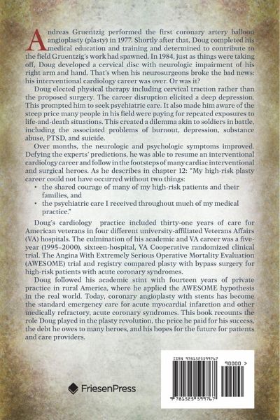 Andreas Gruentzig performed the first coronary artery balloon angioplasty (plasty) in 1977. Shortly after that, Doug completed his medical education and training and determined to contribute to the field Gruentzig's work had spawned. In 1984, just as things were taking off, Doug developed a cervical disc with neurologic impairment of his right arm. That's when his neurosurgeons broke the bad news: his interventional cardiology career was over. Or was it? Doug elected physical therapy including cervical traction rather than the proposed surgery. The career disruption elicited a deep depression. This prompted him to seek psychiatric care. It also made him aware of the steep price many people in his field were paying for repeated exposures to life-and-death situations. This created a dilemma akin to soldiers in battle, including the associated problems of burnout, depression, substance abuse, PTSD, and suicide. Over months, the neurologic and psychologic symptoms improved. Defying the experts' predictions, he was able to resume an interventional cardiology career and follow in the footsteps of many cardiac interventional and surgical heroes. As he describes in chapter 12: "My high-risk plasty career could not have occurred without two things: ¿ the shared courage of many of my high-risk patients and their families, and ¿ the psychiatric care I received throughout much of my medical practice." Doug's cardiology practice included thirty-one years of care for American veterans in four different university-affiliated Veterans Affairs (VA) hospitals. The culmination of his academic and VA career was a five-year (1995-2000), sixteen-hospital, VA Cooperative randomized clinical trial. The Angina With Extremely Serious Operative Mortality Evaluation (AWESOME) trial and registry compared plasty with bypass surgery for high-risk patients with acute coronary syndromes. Doug followed his academic stint with fourteen years of private practice in rural America, where he applied the AWESOME hypothesis in the real world. Today, coronary angioplasty with stents has become the standard emergency care for acute myocardial infarction and other medically refractory, acute coronary syndromes. This book recounts the role Doug played in the plasty revolution, the price he paid for his success, the debt he owes to many heroes, and his hopes for the future for patients and care providers.