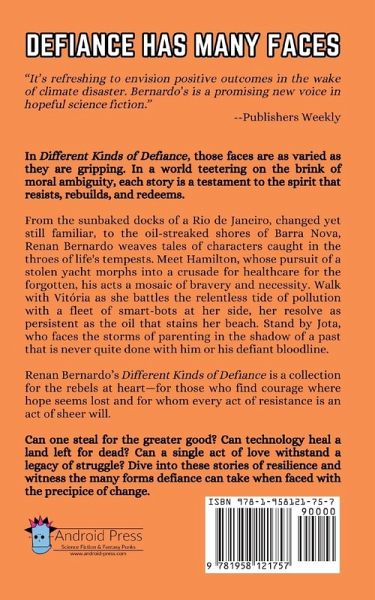 In Different Kinds of Defiance, those faces are as varied as they are gripping. In a world teetering on the brink of moral ambiguity, each story is a testament to the spirit that resists, rebuilds, and redeems. From the sunbaked docks of a Rio de Janeiro, changed yet still familiar, to the oil-streaked shores of Barra Nova, Renan Bernardo weaves tales of characters caught in the throes of life's tempests. Meet Hamilton, whose pursuit of a stolen yacht morphs into a crusade for healthcare for the forgotten, his acts a mosaic of bravery and necessity¿¿. Walk with Vitória as she battles the relentless tide of pollution with a fleet of smart-bots at her side, her resolve as persistent as the oil that stains her beach¿¿. Stand by Jota, who faces the storms of parenting in the shadow of a past that is never quite done with him or his defiant bloodline¿¿. Renan Bernardo's Different Kinds of Defiance is a collection for the rebels at heart-for those who find courage where hope seems lost and for whom every act of resistance is an act of sheer will. Can one steal for the greater good? Can technology heal a land left for dead? Can a single act of love withstand a legacy of struggle? Dive into these stories of resilience and witness the many forms defiance can take when faced with the precipice of change.