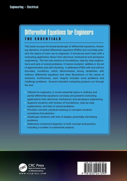 The book surveys the broad landscape of differential equations, including elements of partial differential equations (PDEs). With the use of step-by-step explanations, a review of necessary foundations, and sets of solved problems, it provides concrete clarification to concepts students find abstract (e.g., eigenvalues and eigenvectors