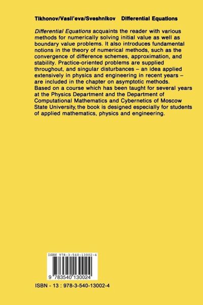 The proposed book is one of a series called "A Course of Higher Mathematics and Mathematical Physics" edited by A. N. Tikhonov, V. A. Ilyin and A. G. Sveshnikov. The book is based on a lecture course which, for a number of years now has been taught at the Physics Department and the Department of Computational Mathematics and Cybernetics of Moscow State University. The exposition reflects the present state of the theory of differential equations, as far as it is required by future specialists in physics and applied mathematics, and is at the same time elementary enough. An important part of the book is devoted to approximation methods for the solution and study of differential equations, e.g. numerical and asymptotic methods, which at the present time play an essential role in the study of mathematical models of physical phenomena. Less attention is paid to the integration of differential equations in elementary functions than to the study of algorithms on which numerical solutionmethods of differential equations for computers are based.