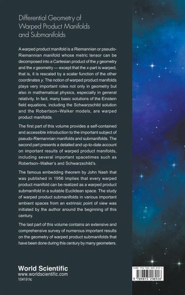 A warped product manifold is a Riemannian or pseudo-Riemannian manifold whose metric tensor can be decomposed into a Cartesian product of the y geometry and the x geometry — except that the x-part is warped, that is, it is rescaled by a scalar function of the other coordinates y. The notion of warped product manifolds plays very important roles not only in geometry but also in mathematical physics, especially in general relativity. In fact, many basic solutions of the Einstein field equations, including the Schwarzschild solution and the Robertson–Walker models, are warped product manifolds. The first part of this volume provides a self-contained and accessible introduction to the important subject of pseudo-Riemannian manifolds and submanifolds. The second part presents a detailed and up-to-date account on important results of warped product manifolds, including several important spacetimes such as Robertson–Walker's and Schwarzschild's. The famous John Nash's embedding theorem published in 1956 implies that every warped product manifold can be realized as a warped product submanifold in a suitable Euclidean space. The study of warped product submanifolds in various important ambient spaces from an extrinsic point of view was initiated by the author around the beginning of this century. The last part of this volume contains an extensive and comprehensive survey of numerous important results on the geometry of warped product submanifolds done during this century by many geometers.