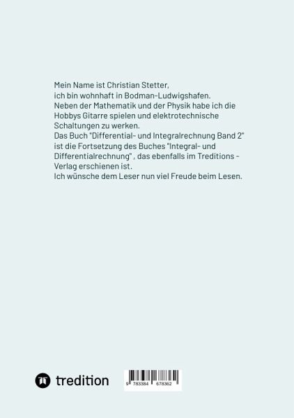 In meinem Buch will ich dem Leser die "Differential- und Integralberechnung" nahe bringen. Mein Buch erklärt diese Sparte der Mathematik anschaulich mit Formeln und Skizzen. Es ist die Fortsetzung des Buches "Integral- Differentialberechnung", das auch im Treditionsverlag erschienen ist.
