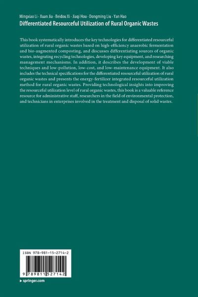 This book systematically introduces the key technologies for differentiated resourceful utilization of rural organic wastes based on high-efficiency anaerobic fermentation and bio-augmented composting, and discusses differentiating sources of organic wastes, integrating recycling technologies, developing key equipment, and researching management mechanisms. In addition, it describes the development of viable techniques and low-pollution, low-cost, and low-maintenance equipment. It also includes the technical specifications for the differentiated resourceful utilization of rural organic wastes and presents the energy-fertilizer integrated resourceful utilization method for rural organic wastes. Providing technological insights into improving the resourceful utilization level of rural organic wastes, this book is a valuable reference resource for administrative staff, researchers in the field of environmental protection, and technicians in enterprises involved in the treatment and disposal of solid wastes.