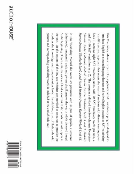 This Vocabulary Manual is part of a supplemental SAT vocabulary program designed to introduce English as a second language learners and native English speakers to SAT vocabulary in a differentiated approach that meets the needs of students with diverse learning styles. Book 1 contains eight SAT vocabulary units, with 20 SAT vocabulary words per unit, a total of 160 SAT words from A to Z. The program is divided into five volumes: Vocabulary Manual; Teacher's Manual; Student's Practice Exercises Workbooks Levels 4 and 3; Student's Practice Exercises Workbooks Levels 2 and 1; and Student's Practice Exercises Worbook Level 1A. In this Vocabulary Manual the words are presented with its part of speech, a sentence, definition(s), synonym(s) and a real picture that illustrates the way in which the word is used. At the beginning of each unit, the user will find a short list of the words that will appear in the unit. At the bottom of the list, two websites are provided as resources to practice the words at the knowledge and comprehension levels. In addition, a set of flashcards with pictures and corresponding vocabulary words is included at the end of each unit.