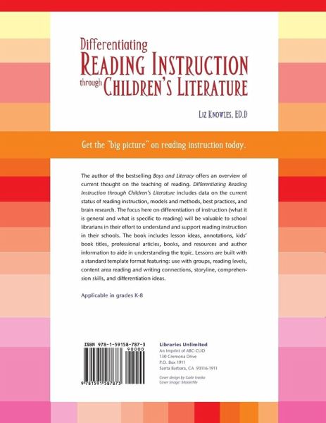 A bestselling author delivers the "big picture" on reading instruction today. The author of the bestselling Boys and Literacy offers an overview of current thought on the teaching of reading. Differentiating Reading Instruction through Children's Literature includes data on the current status of reading instruction, models and methods, best practices, and brain research. The focus here on differentiation of instruction (what it is general and what is specific to reading) will be valuable to school librarians in their effort to understand and support reading instruction in their schools. The book includes lesson ideas, annotations, kids' book titles, professional articles, books, and resources and author information to aide in understanding the topic. Lessons are built with a standard template format featuring: use with groups, reading levels, content area reading and writing connections, storyline, comprehension skills, and differentiation ideas. Applicable in grades K-8