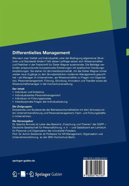 Wie kann man Vielfalt und Individualität unter der Bedingung allgemeiner Strukturen und Standards fördern? Mit dieser Leitfrage setzen sich Wissenschaftler und Praktiker in der Festschrift für Dieter Wagner auseinander. Die Beiträge verbinden anspruchsvolle konzeptionelle Erörterungen mit praktischen Handlungsempfehlungen. Sie stehen für die Interdisziplinarität, mit der Dieter Wagner immer wieder neue Zugänge zu den Grundproblemen modernen Managements gesucht hat als Manager im Unternehmen, als Wissenschaftler zu Fragen von Organisation, Personalmanagement, Führung, Gründung, Innovation und Transfer sowie als Wissenschaftsmanager in der Hochschulverwaltung.