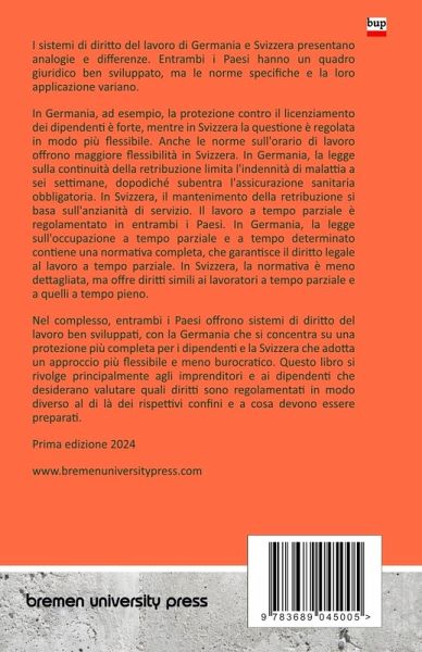I sistemi di diritto del lavoro di Germania e Svizzera presentano analogie e differenze. Entrambi i Paesi hanno un quadro giuridico ben sviluppato, ma le norme specifiche e la loro applicazione variano. In Germania, ad esempio, la protezione contro il licenziamento dei dipendenti è forte, mentre in Svizzera la questione è regolata in modo più flessibile. Anche le norme sull'orario di lavoro offrono maggiore flessibilità in Svizzera. In Germania, la legge sulla continuità della retribuzione limita l'indennità di malattia a sei settimane, dopodiché subentra l'assicurazione sanitaria obbligatoria. In Svizzera, il mantenimento della retribuzione si basa sull'anzianità di servizio. Il lavoro a tempo parziale è regolamentato in entrambi i Paesi. In Germania, la legge sull'occupazione a tempo parziale e a tempo determinato contiene una normativa completa, che garantisce il diritto legale al lavoro a tempo parziale. In Svizzera, la normativa è meno dettagliata, ma offre diritti simili ai lavoratori a tempo parziale e a quelli a tempo pieno. Nel complesso, entrambi i Paesi offrono sistemi di diritto del lavoro ben sviluppati, con la Germania che si concentra su una protezione più completa per i dipendenti e la Svizzera che adotta un approccio più flessibile e meno burocratico. Questo libro si rivolge principalmente agli imprenditori e ai dipendenti che desiderano valutare quali diritti sono regolamentati in modo diverso al di là dei rispettivi confini e a cosa devono essere preparati.