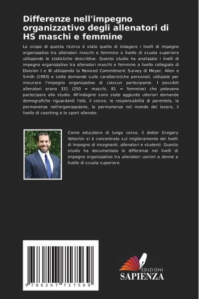 Lo scopo di questa ricerca è stato quello di indagare i livelli di impegno organizzativo tra allenatori maschi e femmine a livello di scuola superiore utilizzando le statistiche descrittive. Questo studio ha analizzato i livelli di impegno organizzativo tra allenatori maschi e femmine a livello collegiale di Division I e III utilizzando la Revised Commitment Survey di Meyer, Allen e Smith (1993) e sette domande sulle caratteristiche personali, utilizzate per misurare l'impegno organizzativo di ciascun partecipante. I possibili allenatori erano 331 (250 = maschi, 81 = femmine) che potevano partecipare allo studio. All'indagine sono state aggiunte ulteriori domande demografiche riguardanti l'età, il sesso, le responsabilità di parentela, la permanenza nell'organizzazione, la permanenza nel mondo del lavoro, il livello di coaching e lo sport allenato.