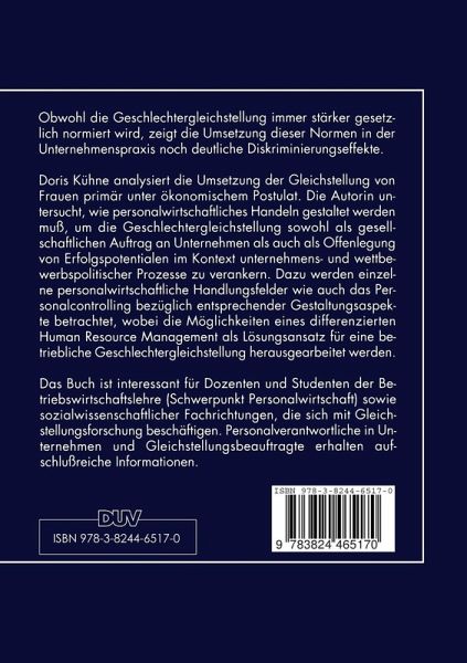 Obwohl die Geschlechtergleichstellung immer stärker gesetzlich normiert wird, bestehen hinsichtlich der Umsetzung dieser Normen in der Unternehmenspraxis noch erhebliche Defizite. Doris Kühne analysiert die Umsetzung der Gleichstellung von Frauen primär unter ökonomischem Postulat. Das vorgestellte Konzept des differenzierten Human Resource Management verdeutlicht, wie personalwirtschaftliches Handeln gestaltet werden kann, um die Geschlechtergleichstellung sowohl als gesellschaftlichen Auftrag an Unternehmen, als auch als Offenlegung von Erfolgspotentialen im Kontext unternehmens- und wettbewerbspolitischer Prozesse zu verankern. Dazu werden einzelne personalwirtschaftliche Handlungsfelder wie beispielsweise Personalbeurteilung, -entwicklung sowie auch das Personalcontrolling bezüglich entsprechender Gestaltungsaspekte betrachtet.
