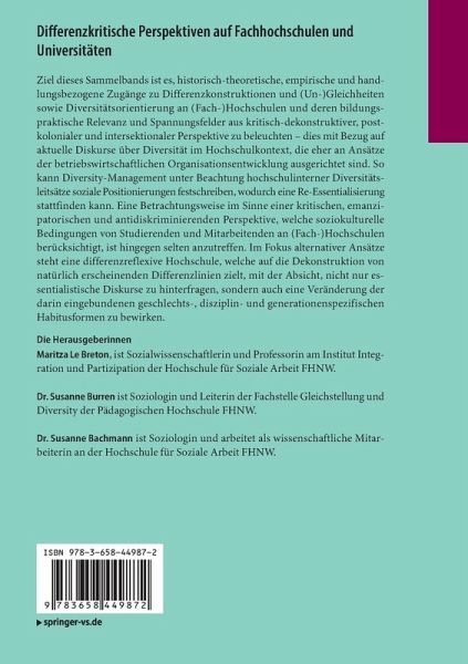 Ziel dieses Sammelbands ist es, historisch-theoretische, empirische und handlungsbezogene Zugänge zu Differenzkonstruktionen und (Un-)Gleichheiten sowie Diversitätsorientierung an (Fach-)Hochschulen und deren bildungspraktische Relevanz und Spannungsfelder aus kritisch-dekonstruktiver, postkolonialer und intersektionaler Perspektive zu beleuchten - dies mit Bezug auf aktuelle Diskurse über Diversität im Hochschulkontext, die eher an Ansätze der betriebswirtschaftlichen Organisationsentwicklung ausgerichtet sind. So kann Diversity-Management unter Beachtung hochschulinterner Diversitätsleitsätze soziale Positionierungen festschreiben, wodurch eine Re-Essentialisierung stattfinden kann. Eine Betrachtungsweise im Sinne einer kritischen, emanzipatorischen und antidiskriminierenden Perspektive, welche soziokulturelle Bedingungen von Studierenden und Mitarbeitenden an (Fach-)Hochschulen berücksichtigt, ist hingegen selten anzutreffen. Im Fokus alternativer Ansätze steht eine differenzreflexive Hochschule, welche auf die Dekonstruktion von natürlich erscheinenden Differenzlinien zielt, mit der Absicht, nicht nur essentialistische Diskurse zu hinterfragen, sondern auch eine Veränderung der darin eingebundenen geschlechts-, disziplin- und generationenspezifischen Habitusformen zu bewirken.