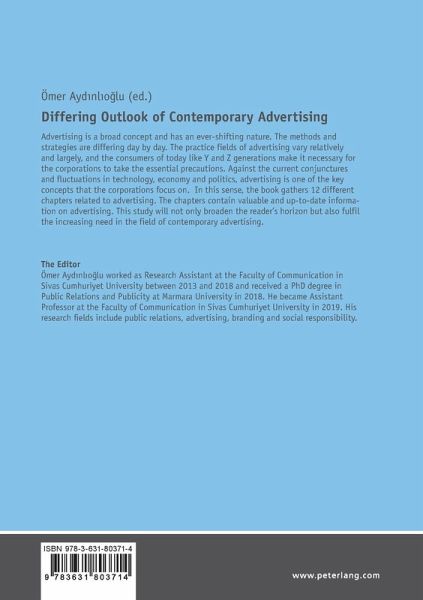 Advertising is a broad concept and has an ever-shifting nature. The methods and strategies are differing day by day. The practice fields of advertising vary relatively and largely, and the consumers of today like Y and Z generations make it necessary for the corporations to take the essential precautions. Against the current conjunctures and fluctuations in technology, economy and politics, advertising is one of the key concepts that the corporations focus on. In this sense, the book gathers 12 different chapters related to advertising. The chapters contain valuable and up-to-date information on advertising. This study will not only broaden the reader's horizon but also fulfil the increasing need in the field of contemporary advertising.