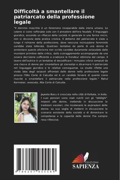 ¿Il dominio maschile è un fenomeno inseparabile dalla storia umana. Le catene si sono rafforzate solo con il prevalere dell'era feudale. Il linguaggio giuridico, essendo un riflesso della società in generale in una forma micro, non si discosta dalla pratica cronica. Il dettame del patriarcato è stato a lungo il richiamo della professione, dove nessuna insinuazione femminile sarebbe stata tollerata. Qualsiasi tentativo da parte di una donna di annientare questo aforisma non scritto sarebbe duramente ostacolato dalle munizioni primitive della critica, dallo scoraggiamento accompagnato da una severa decrizione sufficiente a sradicare la frondeur ottimista dal campo. Il lavoro dell'autrice è un tentativo di decodificare i minuziosi sforzi compiuti da una classe di donne per smantellare gli stereotipi e disarmare il patriarcato nel linguaggio giuridico e le relative conseguenze. Lo studio riflette una vivida idea degli ostacoli affrontati dalle donne nella professione legale presso l'Alta Corte di Calcutta ed è un candido fervore di quanto siano riuscite a smantellare il patriarcato nella professione legale.¿ Rahul Karmakar, avvocato, Alta Corte di Calcutta.