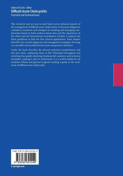 1 Anatomy of the gallbladder and biliary tract.- 2 Pathophysiology and diagnosis of acute calculous cholecystitis.- 3 Pathophysiology and diagnosis of acute acalculous cholecystitis.- 4 Guidelines for the management of acute cholecystitis.- 5 Tokyo Guidelines and their limits.- 6 Preoperative evaluation and management of acute cholecystitis: Optimal timing and surgical approach.- 7 Preoperative evaluation and decision making. When to operate and by which approach: Tube cholecystostomy.- 8 Difficult laparoscopic cholecystectomy: Intra-operative evaluation.- 9 Difficult laparoscopic cholecystectomy: Timing for conversion.- 10 Difficult laparoscopic cholecystectomy: When to convert to open technique.- 11 When it's safe to continue laparoscopically.- 12 Open partial or subtotal cholecystectomy: techniques and indications.- 13 Laparoscopic sub total cholecystectomy and other laparoscopic techniques.- 14 Indocyanine green role in acute cholecystitis.- 15 How to avoid CBD injuries and their classification.- 16 Iatrogenic lesions of the biliary tree: the role of a multidisciplinary approach