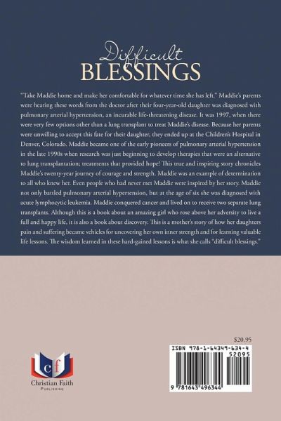 "Take Maddie home and make her comfortable for whatever time she has left." Maddie's parents were hearing these words from the doctor after their four-year-old daughter was diagnosed with pulmonary arterial hypertension, an incurable life-threatening disease. It was 1997, when there were very few options other than a lung transplant to treat Maddie's disease. Because her parents were unwilling to accept this fate for their daughter, they ended up at the Children's Hospital in Denver, Colorado. Maddie became one of the early pioneers of pulmonary arterial hypertension in the late 1990s when research was just beginning to develop therapies that were an alternative to lung transplantation; treatments that provided hope! This true and inspiring story chronicles Maddie's twenty-year journey of courage and strength. Maddie was an example of determination to all who knew her. Even people who had never met Maddie were inspired by her story. Maddie not only battled pulmonary arterial hypertension, but at the age of six she was diagnosed with acute lymphocytic leukemia. Maddie conquered cancer and lived on to receive two separate lung transplants. Although this is a book about an amazing girl who rose above her adversity to live a full and happy life, it is also a book about discovery. This is a mother's story of how her daughters pain and suffering became vehicles for uncovering her own inner strength and for learning valuable life lessons. The wisdom learned in these hard-gained lessons is what she calls "difficult blessings."