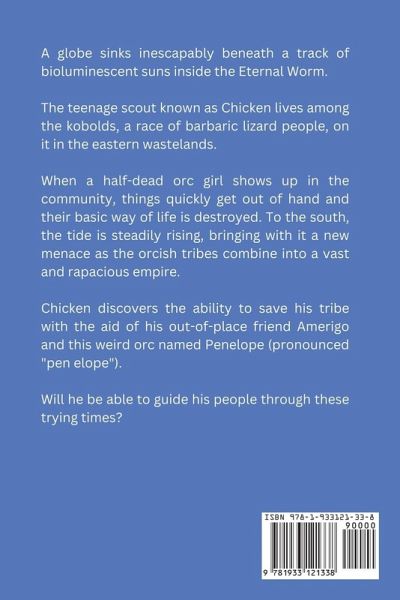 A globe sinks inescapably beneath a track of bioluminescent suns inside the Eternal Worm. The teenage scout known as Chicken lives among the kobolds, a race of barbaric lizard people, on it in the eastern wastelands. When a half-dead orc girl shows up in the community, things quickly get out of hand and their basic way of life is destroyed. To the south, the tide is steadily rising, bringing with it a new menace as the orcish tribes combine into a vast and rapacious empire. Chicken discovers the ability to save his tribe with the aid of his out-of-place friend Amerigo and this weird orc named Penelope (pronounced "pen elope"). Will he be able to guide his people through these trying times?