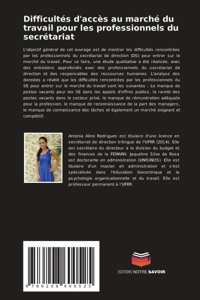 L'objectif général de cet ouvrage est de montrer les difficultés rencontrées par les professionnels du secrétariat de direction (DS) pour entrer sur le marché du travail. Pour ce faire, une étude qualitative a été réalisée, avec des entretiens approfondis avec des professionnels du secrétariat de direction et des responsables des ressources humaines. L'analyse des données a révélé que les difficultés rencontrées par les professionnels du SE pour entrer sur le marché du travail sont les suivantes : Le manque de postes vacants pour les SE dans les appels d'offres publics, la rareté des postes vacants dans le secteur privé, le manque de rémunération adéquate pour la profession, le manque de reconnaissance de la part des managers, le manque de connaissance des tâches et également un marché exigeant et compétitif.