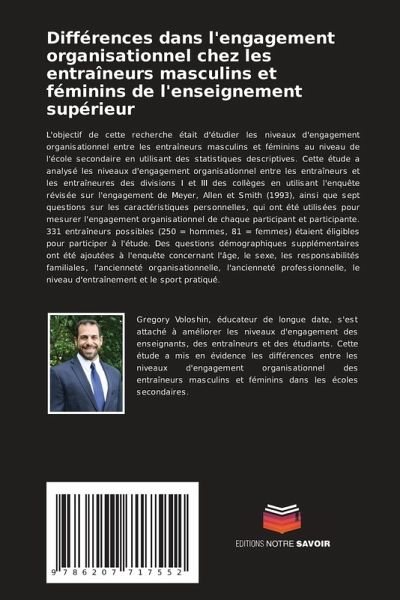 L'objectif de cette recherche était d'étudier les niveaux d'engagement organisationnel entre les entraîneurs masculins et féminins au niveau de l'école secondaire en utilisant des statistiques descriptives. Cette étude a analysé les niveaux d'engagement organisationnel entre les entraîneurs et les entraîneures des divisions I et III des collèges en utilisant l'enquête révisée sur l'engagement de Meyer, Allen et Smith (1993), ainsi que sept questions sur les caractéristiques personnelles, qui ont été utilisées pour mesurer l'engagement organisationnel de chaque participant et participante. 331 entraîneurs possibles (250 = hommes, 81 = femmes) étaient éligibles pour participer à l'étude. Des questions démographiques supplémentaires ont été ajoutées à l'enquête concernant l'âge, le sexe, les responsabilités familiales, l'ancienneté organisationnelle, l'ancienneté professionnelle, le niveau d'entraînement et le sport pratiqué.