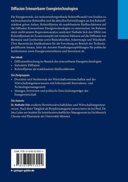 Die Energiewende, der industrieübergreifende Rohstoffwandel von fossilen zu nachwachsenden Rohstoffen und die aktuellen Entwicklungen an denRohstoffmärkten geben Anlass, Rohstoffpreise als marktbasierte Einflussfaktoren auf die Diffusion Erneuerbarer Energietechnologien zu untersuchen. Im Rahmen einer multivariaten Regressionsanalyse analysiert Nathalie Sick den Effekt von Rohstoffpreisen im Zusammenspiel mit weiteren Faktoren auf die Diffusion von Biomasse und Geothermie sowie Biokraftstoffen, Solarenergie und Windkraft. Über theoretische Implikationen für die Forschung im Bereich der Technologiediffusion hinaus, leitet die Autorin Handlungsempfehlungen für politische Institutionen sowie Energieunternehmen und Investoren ab.