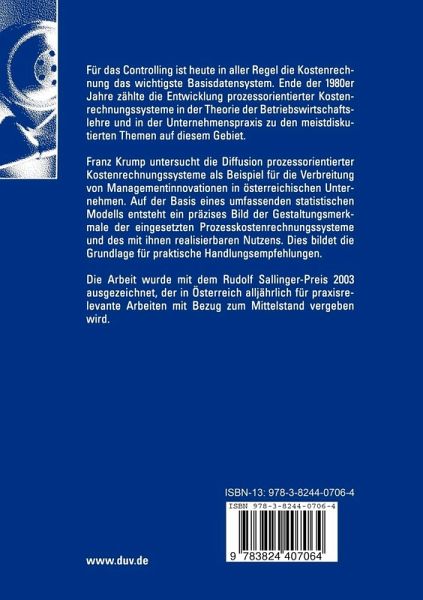 Franz Krump untersucht die Diffusion prozessorientierter Kostenrechnungssysteme als Beispiel für die Verbreitung von Managementinnovationen in österreichischen Unternehmen. Auf der Basis eines umfassenden statistischen Modells entsteht ein präzises Bild der Gestaltungsmerkmale der eingesetzten Prozesskostenrechnungssysteme und des mit ihnen realisierbaren Nutzens. Dies bildet die Grundlage für praktische Handlungsempfehlungen.