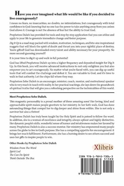 Have you ever imagined what life would be like if you decided to live courageously? I mean no fears, no insecurities, no doubt, no intimidations, but courageous with total confidence in God. Knowing that no one has the power to take anything away from you unless God allows it. Courage is not the absence of fear but the ability to trust God. Prophetess Dalieh has provided the tools and step-by-step application that you can utilize and apply to your life to generate immediate change and to foster purpose. Dig It Up is a road map packed with wisdom, motivation, techniques, and bite-size inspirational nuggets that will block the spirit of doubt and push you into your rightful place of destiny. You're gifted! God has downloaded every talent and ability necessary for your prosperity. No more second-guessing yourself! It is your time to dig it up and walk in full potential! God has lifted Prophetess Dalieh up into a higher frequency and deposited insight for Dig It Up. In this book, you will receive advanced instructions to not only enlighten you but also empower you to act courageously. No matter what you're faced with, you can dig up useful tools that will combat the challenge and defeat it. You are valuable to God, and it's time to walk in authority. Let the chips fall where they may. Prophetess Sebe Dalieh is an encourager, minister, coach, mentor, and motivational speaker and is very much in touch with reality. In her practical teaching, she lays down the groundwork of spiritual truths that will give you a refreshing perspective on the technicalitiesa of this world.