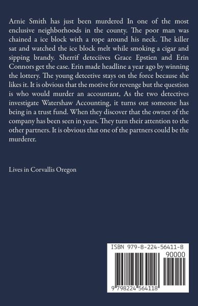 Arnie Smith has just been murdered In one of the most enclusive neighborhoods in the county. The poor man was chained a ice block with a rope around his neck. The killer sat and watched the ice block melt while smoking a cigar and sipping brandy. Sherrif deteciives Grace Epstien and Erin Connors get the case. Erin made headline a year ago by winning the lottery. The young detcetive stays on the force because she likes it. It is obvious that the motive for revenge but the question is who would murder an accountant, As the two detectives investigate Watershaw Accounting, it turns out someone has being in a trust fund. When they discover that the owner of the company has been seen in years. They turn their attention to the other partners. It is obvious that one of the partners could be the murderer.