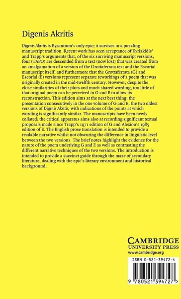 Digenis Akritis is Byzantium's only epic poem, telling of the exploits of a heroic warrior of 'double descent' on the frontiers between Byzantine and Arab territory in Asia Minor in the ninth and tenth centuries. It survives in six versions, of which the two oldest, dating from the thirteenth and fifteenth centuries, are presented here in an edited version. The manuscripts are preserved in the Grottaferrata monastery near Rome and the Escorial Library in Spain. Behind these two versions lies a twelfth-century poem that can now be glimpsed at but not reconstructed. This edition and translation aims at highlighting the nature of the lost poem, and at providing a guide through the maze of recent discussions about the epic and its background.