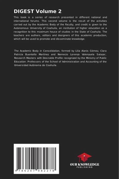 This book is a series of research presented in different national and international forums. This second volume is the result of the activities carried out by the Academic Body of the Faculty, and credit is given to the Autonomous University of Coahuila, an institution of higher education as a recognition to this maximum house of studies in the State of Coahuila. The teachers are authors, editors and designers of this academic production, which will be used to promote and disseminate knowledge.